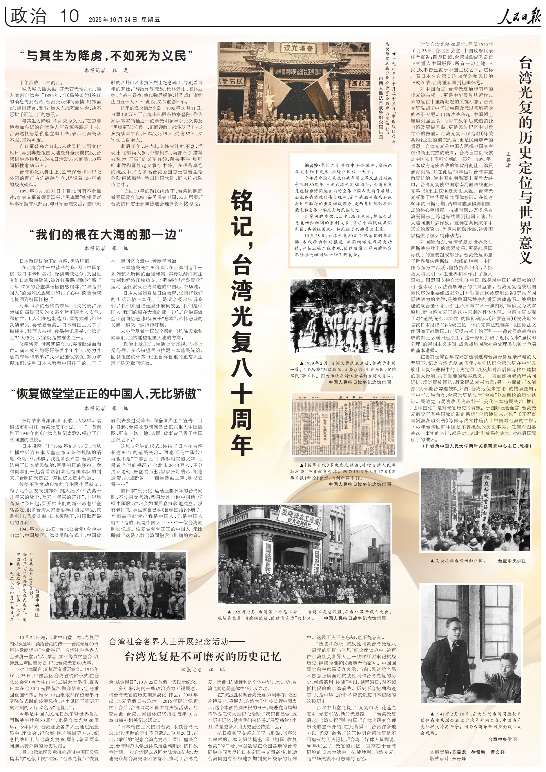 1945年10月25日,台湾中国剧院受降仪式在台北公堂(现中山堂)举行。图片提供:中国人民抗战纪念馆。 1939年2月台湾义勇军成立时,转战浙江、福建,主要从事“抗敌政策、独立诊疗、生产报国、军民慰安”等工作。图为在浙江省金华市开展活动的台湾义勇军。图片提供:中国人民抗战纪念馆。 《新华日报》连发社论,呼吁台湾人民加入抵抗运动,早日光复台湾。图为1943年6月17日《新华日报》社论:“台湾,回归祖国!” 》。图片提供:中国人民抗战纪念馆 人们庆祝台湾回归祖国。台联中央供图 1928年2月,台湾第一个工会联合会——台湾劳工联合总会在台北召开成立大会。网站上贴出一句格言:“同胞们一定要团结起来,团结起来才有力量。”图片提供:中国人民抗战纪念馆。 1928年4月15日,中国共产党领导下的台湾共产党第一次代表大会在上海召开,台湾共产党正式成立。图为台湾共产党主要成员。台联中央供图 1941年2月10日,大陆台湾同胞的抗日组织在重庆联合成立台湾革命联盟,中国共产党积极支持他们的斗争。图为台湾革命联盟成立大会。照片o 台联中央供述 编者按:中共二十届中央四次全会强调,要推动两岸关系和平发展,推进国家统一事业。今年也是中国人民抗日战争胜利80周年、世界反法西斯战争胜利80周年、台湾解放80周年。台湾光复是包括台湾同胞在内的全体中国人民浴血奋斗取得的伟大胜利。这是二战胜利和战后国际秩序的重要组成部分。这是海峡两岸同胞的共同荣耀,也是全体中国人民的民族记忆。海峡两岸同胞应牢记历史、缅怀先烈、崇尚胜利者为台湾解放回归祖国,保卫中华民族共同家园,共同开创祖国统一、民族复兴的美好未来。 10月25日,台湾解放80周年,本版纪念烈士历史功绩,传播二战正确历史观,团结海峡两岸同胞,将发表专题报道,坚决推进祖国统一、民族复兴。 “作为一个正义的公民而死,比作为一个投降的囚犯而活着要好。”记者成龙在1894年至1894年的甲午战争中失败,易烊千玺从未上台。 “城墙上大鼓声响,天空泪流满面,日军其实已经割让台湾了。” 1895年,《马关条约》签订的消息传来,台湾人民愤怒了,罢工并围攻总督府。他们高呼:“希望大家战死,失去台湾,我永远不会放过台湾”。他与希望参加联考的台湾考生王春元一起写了这封信,“与其投降而生,不如作为一个正义的公民而死”。台湾总督唐劲松也立即致函表示台湾民众不满,协议可以无效。自日军登陆台湾那天起,台湾同胞就不断参加从武装抗日到文化抗日、抗大陆抗日等各种形式的抗日活动,近50年来有超过65万人牺牲。台湾彰化市八卦山一味保台和平纪念公园内,两门古炮静静矗立,作为130年前战争的见证。 189年8月5日,随着日军从北向南挺进,客家起义军首领吴唐兴、黑旗军司令员吴彭年率部死守八卦山,与日军展开激战。园内斑驳的八卦山吉伟抗日烈士纪念碑上刻着当年的惨剧:“与敌人殊死搏斗,枪林弹雨,血战三天三夜,直至弹药全部耗尽,约有四五千人成为慈善家……”在这场战斗中,起义军给日军造成了巨大损失。军队。反抗的火焰蔓延到全岛。 1895年10月11日,日军18000人在台湾南部屏东市番寮登陆。高平客家首领之一肖光明率领村义勇军和部分黑旗军战士与敌人正面交锋。战斗从早上八点一直持续到中午对了。日军造成15人死亡、57人受伤,叛军伤亡100余人。此后几年,岛上叛乱不断,叛乱头目被称为“暴力三人”:北部的建达、中部的柯铁、南部的林少茂。苗栗事变、七宝岛事变、雾社起义,不仅震惊了中国,也震惊了世界各国。在严酷的抗日战争中,死亡人数达5万多人。一群台湾爱国志士冒着生命危险穿越台湾海峡,回到祖国,参加抗日战争。台湾抗日同胞联谊会会长林明宗表示,在50年的殖民统治中,台湾同胞高举爱国主义旗帜,为保卫祖国而英勇奋斗,永不放弃。 “我们的根在海的另一边。”张硕 记者 日治时期的台湾是黑暗而压抑的。 “什么时候我在台湾台中一中留学时,因指点中国象棋被日本老师打骂。 “我也因为不跟日本警察打招呼而被打、被踢、被绑、被拘留。”17岁的台湾同胞洪耀英感到羞辱。“一种强烈的‘我是中国人’的民族感情刻在我的心里,我盼着台湾得到解放,回到祖国的怀抱。”14岁的台湾同胞黄浩登痛失了父亲。 “我的父亲是一名高级矿业官员,他完全不知道自己的安全。他与矿主、工人秘密制造刀具、飞镖等武器,组织武装起义,收复台湾。日本帝国主义发出了逮捕令。数百人被捕、遭受残酷酷刑和屠杀。台湾有72名矿工惨死,我父亲就是受害者之一。 “我的父亲惨死,我的母亲悲痛万分又怒,突发脑溢血而死。未成年的弟弟靠打零工,努力养活黄厚恩和弟弟。黄哈哈特在关于退学的文章中写道:“我对我的国家和我的家庭怀有深深的仇恨,我努力学习知识,让日本人民了解中国孩子的抱负。”在日本殖民统治的50年里,日本在台湾制造了一系列惨绝人寰的血腥悲剧,对台湾进行残酷的高压控制、经济压迫和掠夺,强行进行“帝国化”运动,企图灭绝台湾中华兄弟的心血。 “日本人强迫我们普及日语教育,强迫我们的生活方式日本化。然而,我的父亲经常告诉我们:‘我们是福建省泉州同安县人,我们是中国人,我们的根在大洋彼岸。’”他的台湾同胞阿察说。海金临终前回忆道。他担心孩子们会“忘根”,悲伤的父