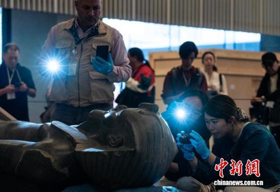 照片展示文化h来自中国和埃及的文物专家在打开包装后仔细检查了曼尼普塔雕像。图片提供:华报记者侯宇。