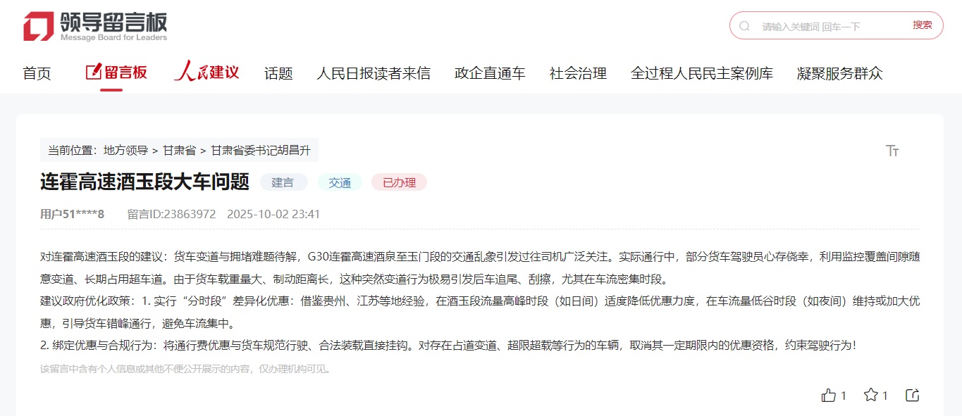 网友留言截图 人民网兰州11月6日电(记者米媛)近日,甘肃有网友通过人民网“领导人公告栏”报道G30。
